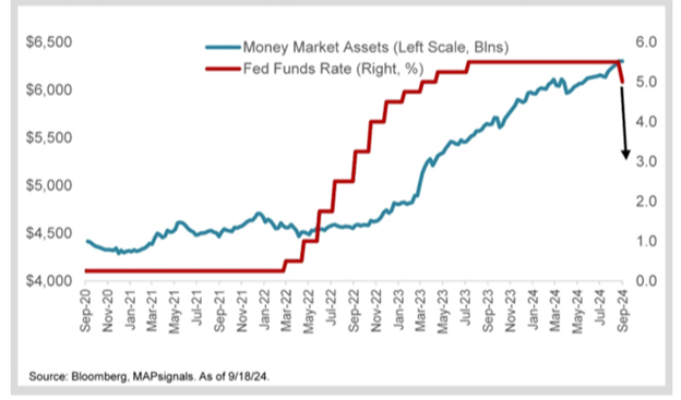 Clearly, money market assets are already searching for new homes as rates fall. This trend will only continue as the odds are now calling for the federal funds rate to reach a 3% handle in about a year or so:
