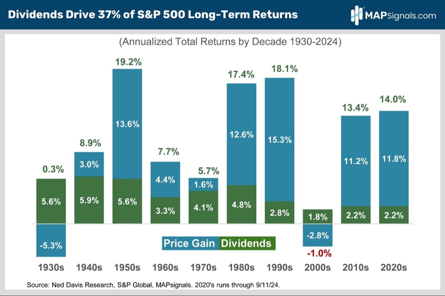 This chart shows the power of compounding dividends and reinvestments over time. Reinvesting growing dividend payouts significantly contributes to equity returns. Even in the S&P 500, 37% of the long-term returns come from dividends.