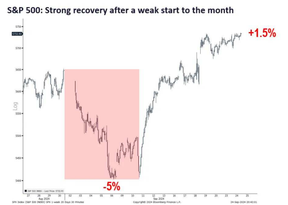 This impressive comeback also bucks the trend of history: since 1928, when indices drop 1.5% or more in the first week of September, there has never been a single prior instance where equities were then positive for the month.