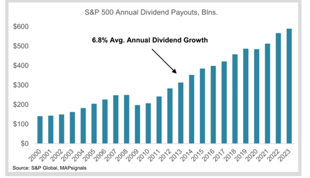 The annual growth of your reinvested payouts supercharges long-term compounding. For example, since 2000, S&P 500 dividends have more than quadrupled from $139 billion to $588 billion. That alone equates to 6.8% annual income growth.