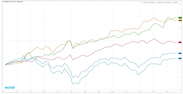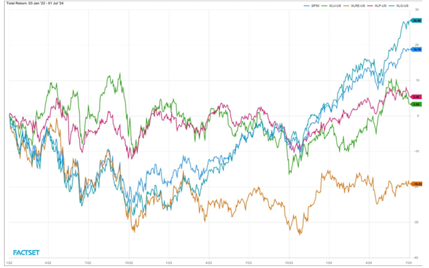 Looking at sector performance since July below, high-yielding utilities have gained 19.2%, real estate is up 18.2%, and staples are up 9.3%. In that time the S&P 500 rose 2.7%.