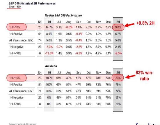 Next, since 1928, after a 10% gain in the first half of the year, equity markets are higher in the second half of the year, averaging a 9.8% gain in 83% of instances: