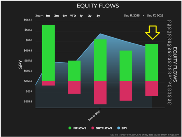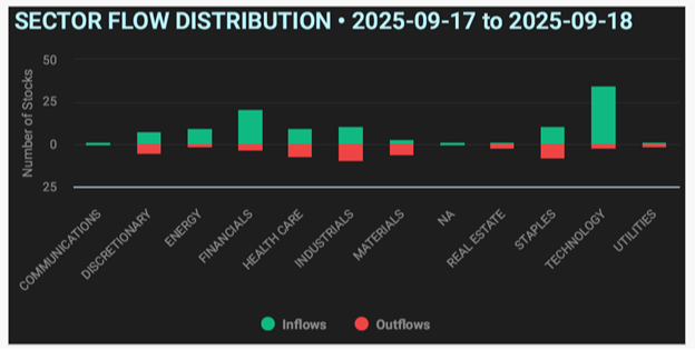 We think this is notable because while the market price itself had significant internal volatility and couldn’t decide where it wanted to go, when you look under the hood, overall equity inflows outpaced outflows at a 2.4 ratio. On Sept. 17, there were 149 “big money” signals, with 105 being inflows and 44 being outflows: