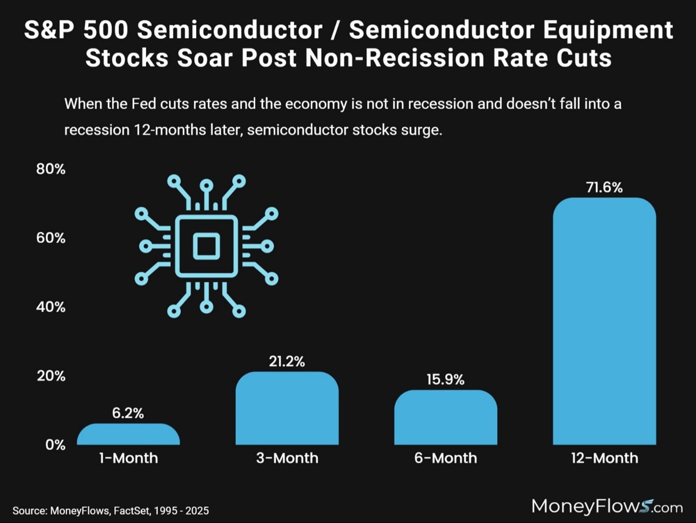 Lastly, again going back to 1995, when the Fed cuts rates and the economy isn't in a recession, the forward 12-month average return for semiconductors is a staggering 71.6%: