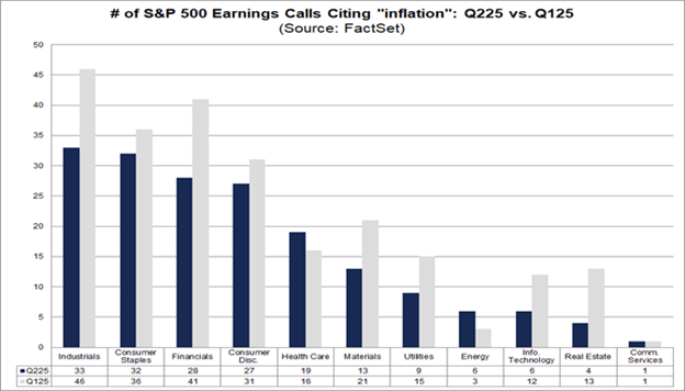 This pivot from inflation is aligned with the recent significant decrease in inflation mentions on earnings calls. Corporate executives are not discussing it as much: