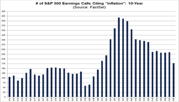 The current number is below the five-year average of 267 and the 10-year average of 195. Perhaps most importantly, this quarter marked the lowest number of inflation mentions in earnings commentary since 2020.
