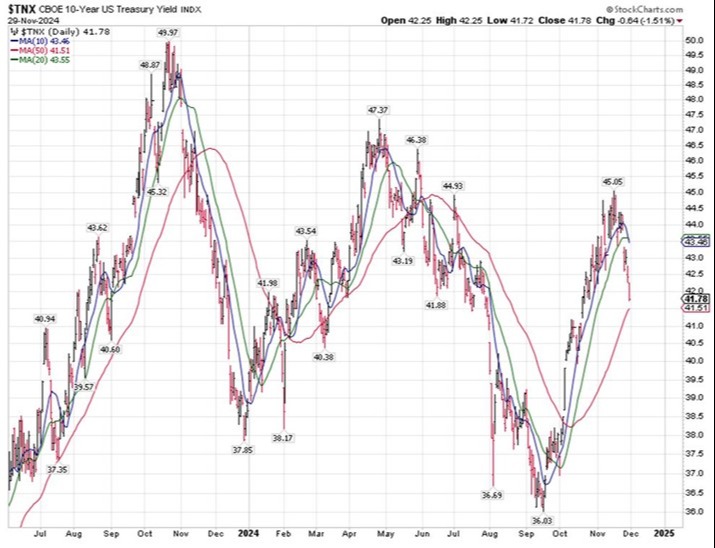 As a result of these developments, the 10-year bond yield quickly declined from 4.5% on Nov. 15, to close out the month at 4.18% in strong fashion: