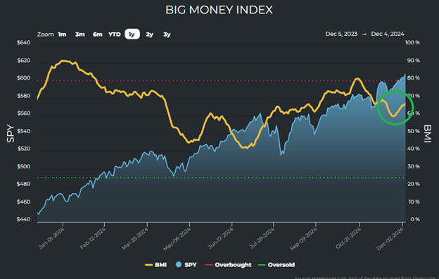 The “big money” is already telling us what to expect going into next year due to the strength of the underlying fundamental data. MAPsignals’ trusty Big Money Index (BMI), a 25-day moving average of “big money” buys and sells, is rising after a period of volatility: