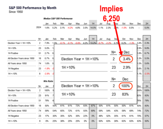 Since 1950, when the S&P 500 is up over 10% in the first half of the year and it's also an election year, the median December return is 3.4%, with a hit ratio of 100% of the time.
