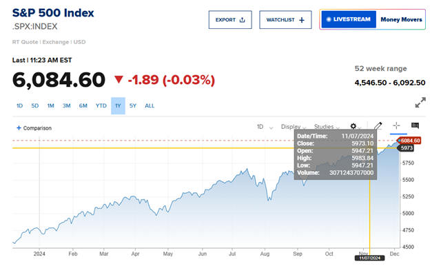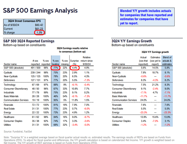 More data that conflicts with retail investor sentiment is the fact that the third quarter earnings season for 2024 is nearly done. This time around, 77% of S&P 500 companies beat consensus earnings expectations, with a blended earnings growth rate of 5.8%. It’s the fifth consecutive quarter of year-over-year earnings growth.