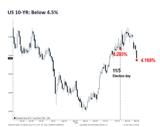 Lower long-term bond yields were squarely tied to the latest set of inflation data coming in at forecasted levels. They were then supercharged by President-elect Trump's choice of Scott Bessent as Treasury Secretary. He is considered a moderate choice and someone who may temper some tariff-related risks. He could also take aim at the budget deficit, which raised investor confidence about the economic outlook and government fiscal discipline.