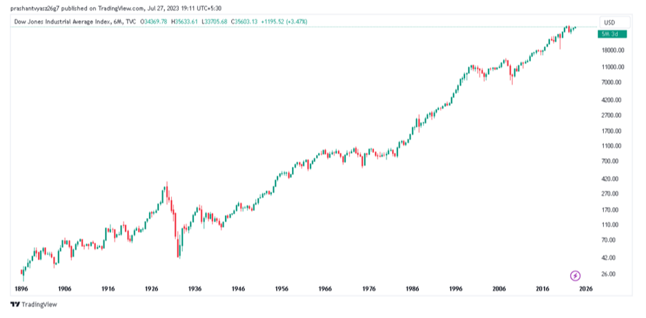 That chart reinforces the existence of volatility and painful periods. The path to glory isn’t linear. That said, the path is undeniably real. Since 1900, the Dow Jones Industrial Average# has grown over 127,000%.