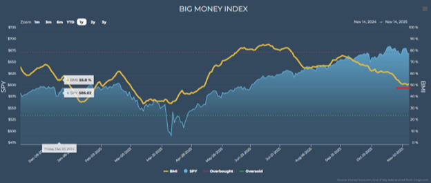 Finally, the trusty Big Money Index slowed due to dropping outflows and volumes, creating a floor about a week ago: