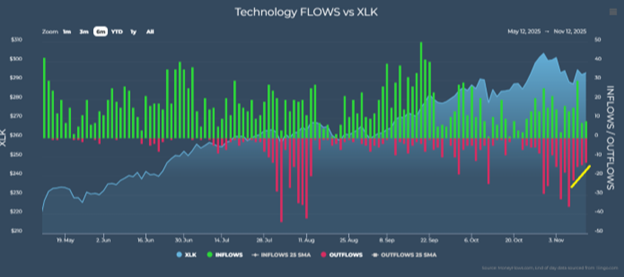 This support is even more evident in the chart below, where you can see how outflows within technology have begun to quickly subside: