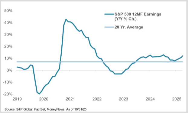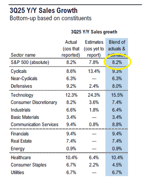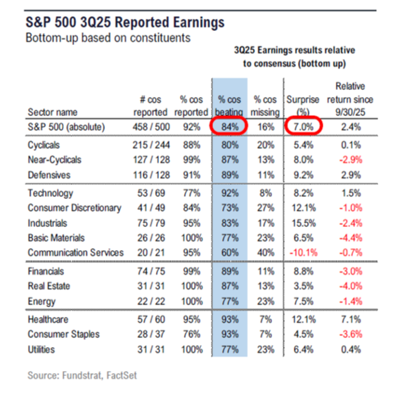 The confluence of positive data is further reflected in third-quarter earnings. As of this writing, 92% of S&P 500 companies reported results. Of them, 84% reported earnings surprises with an average beat of 7% above estimates: