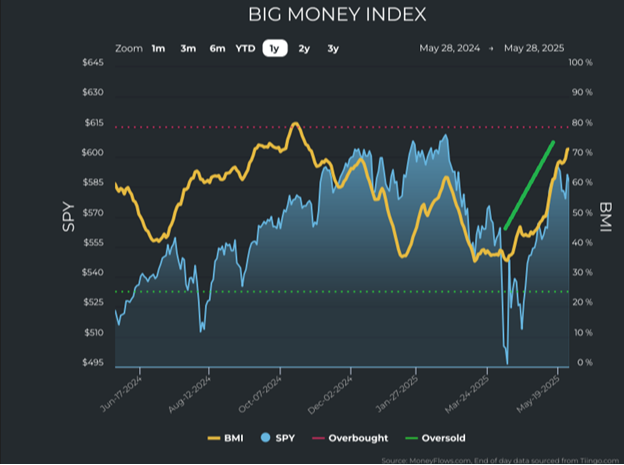 Many weeks ago, our data analysis signaled upside, even as headlines screamed fear. And the trusty Big Money Index from our friends at MoneyFlows (formerly MAPsignals) shows real-time demand for stocks: