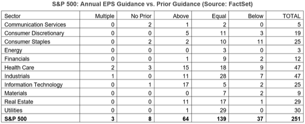 Of these 251 companies, 139 maintained guidance, 64 guided higher, and only 37 provided lower guidance; eight companies initiated new guidance where they had no prior outlook: