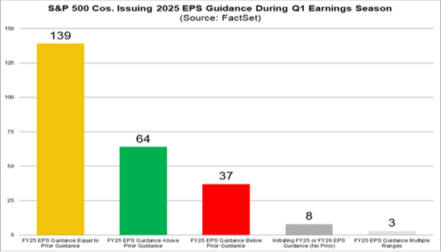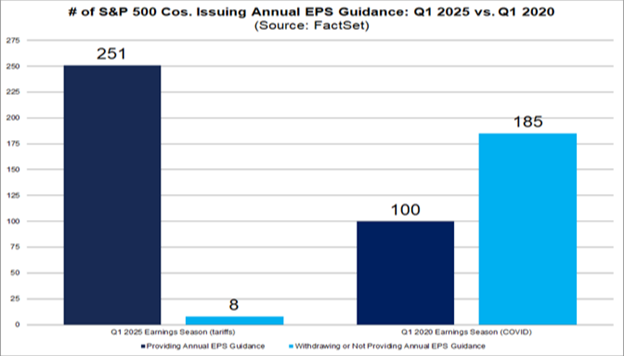 For comparison, during the first-quarter 2020 earnings season (the start of the pandemic), 185 companies in the S&P 500 withdrew or did not update prior annual EPS guidance. On the other hand, this past quarter, 251 companies provided EPS guidance for the full year 2025: