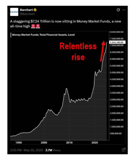 More support for continued equity strength is the fact that this is probably still the most hated rally in recent memory. There is still a staggering amount of cash sitting on the sidelines in money markets: