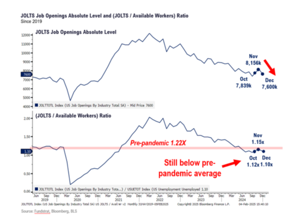 Our last data point supporting objective calmness while panicked investors hit the exits is the labor market. More specifically, last Tuesday the December Job Openings and Labor Turnover Survey (JOLTS) showed job openings fell to 7.6 million versus a consensus expectation of 8 million: