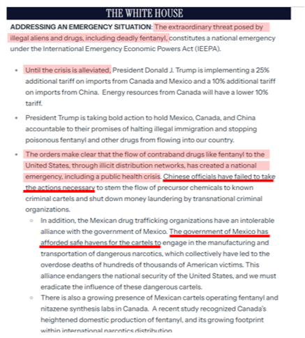 First, last week’s tariff tantrum is really part of the war on drugs, not an actual trade war. This is an important distinction and was made clear by the statement from the White House, which focused on illicit drugs, not trade practices: