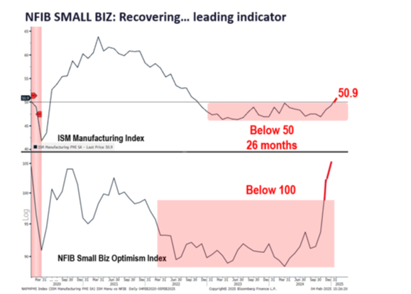 Furthermore, as the chart below shows, small business optimism is rising quickly. Historically, this has been a leading indicator, moving in tandem or slightly ahead of the ISM Manufacturing Index.