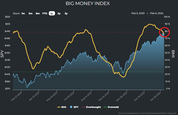 Let’s keep in mind though how we're 14 weeks into this current rally. The last two extended rallies were 16 and 19 weeks, respectively. Also, MAPsignals’ trusty Big Money Index (BMI), a 25-day moving average of all “big money” professional investor buys and sells, recently fell from the overbought level: