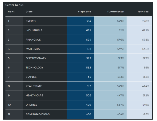 Understanding the potential risk in the short term, let’s now turn to sector performance. There’s been a change in leadership as energy took the top spot in the MAPsignals sector rankings over the last few weeks in potential anticipation of inflation risk: