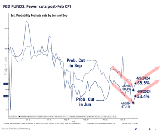 The 10-year yield increase was a direct response to the shift in Fed rate cut expectations. Markets are now betting on the first cut being in September as opposed to June: