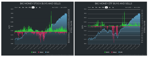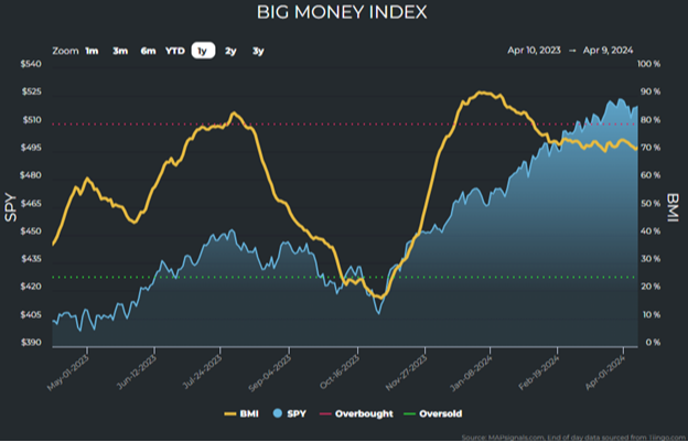 With this new data, we must closely monitor what truly moves markets – buying and selling from “big money” professional investors. The data for the last few months has shown MAPsignals’ trusty Big Money Index (BMI), a 25-day moving average of “big money” investor netted buys and sells, to be sideways after falling from overbought territory in February: