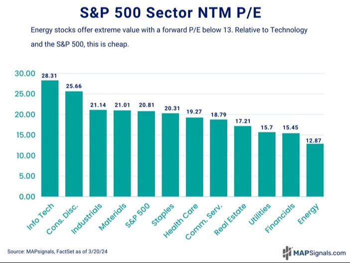 - Speaking of value, energy stocks were outright cheap at the end of March. The S&P 500* has a forward-looking price to earnings ratio of 20.81 while the energy sector’s forward P/E is 12.87: