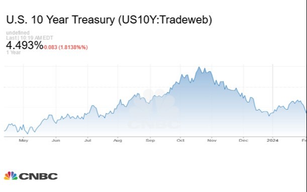 Furthermore, stocks were hurt by the 10-year Treasury yield, which jumped to nearly 4.5%: