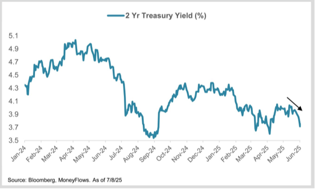 The two-year Treasury yield historically acts as a proxy for anticipated Fed policy because Fed policy controls the short end of the curve, not the long end. As you can see, the two-year yield fell to around 3.87% from 4.35% in February: