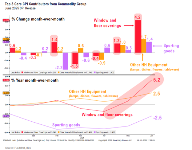 So, now you may ask why we’re not too worried. It’s because even with inventory commodity front loading, overall core prices only rose 0.2% month-to-month, which was below expectations. That means many other categories are continuing to cool seemingly at a rate faster than any significant impact from tariff-related price increases.