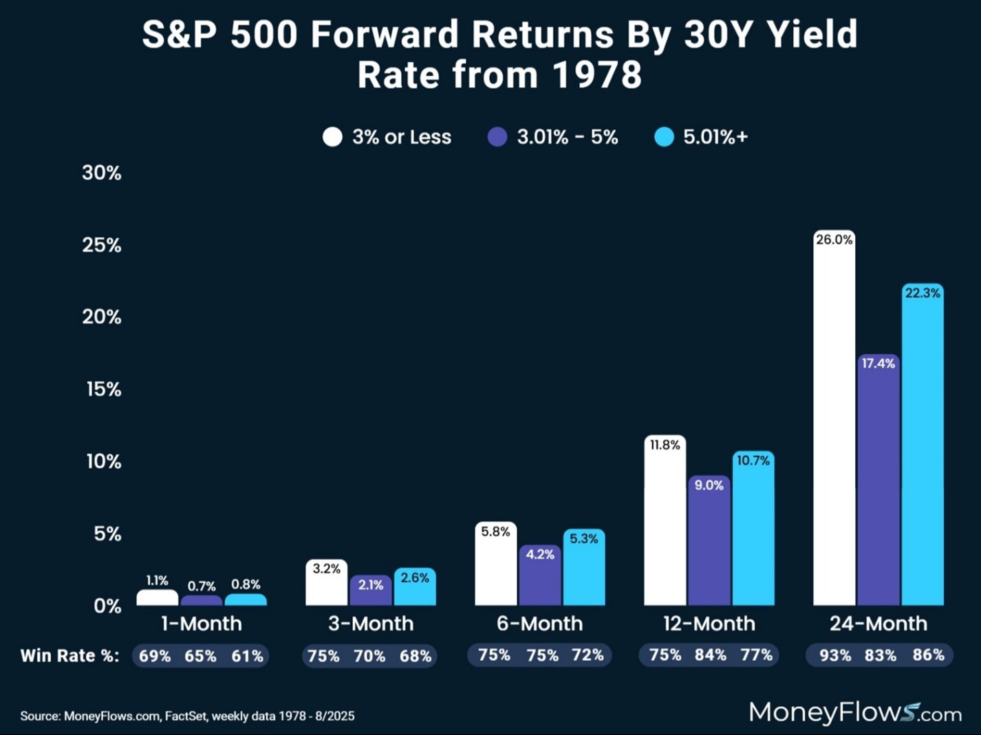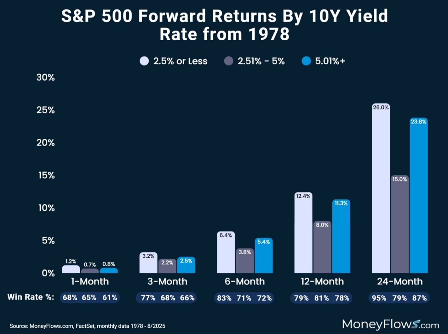 Our friends at MoneyFlows were kind enough to research going back to 1978 showing how, in the short to intermediate forward-looking time period, there’s plenty of resilience and market strength in the S&P 500:
