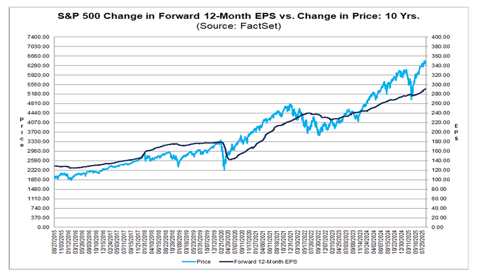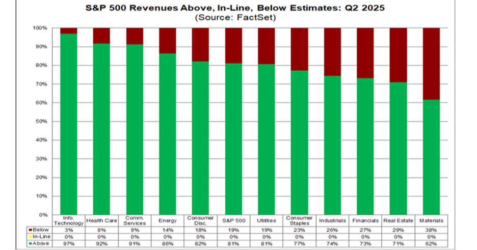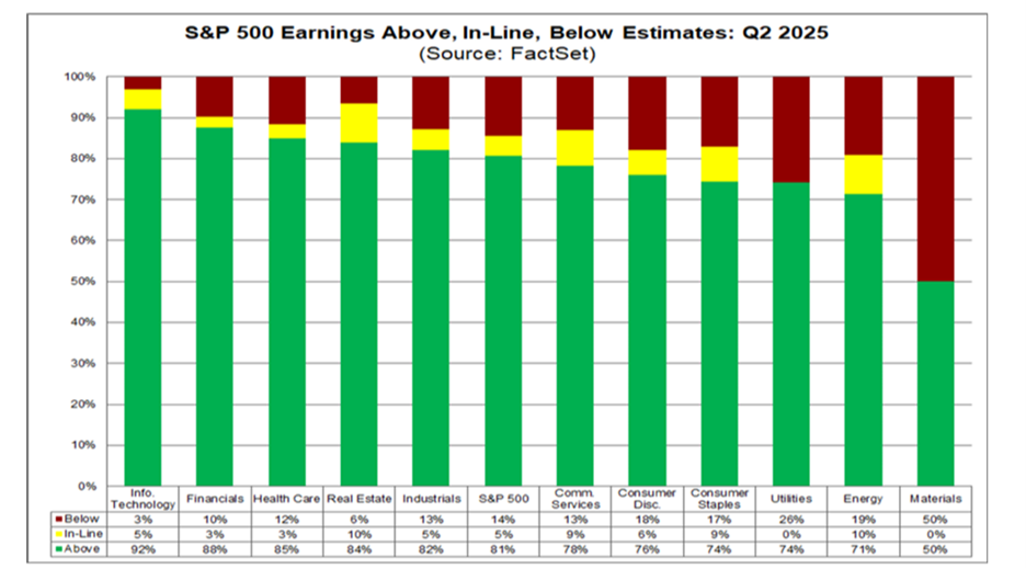 3. Upward Revisions: The EPS growth rate ended up at 11.9%, but on June 30 (when earnings season started), the projection was only 4.8%. All but one sector reported higher earnings due to positive EPS surprises: