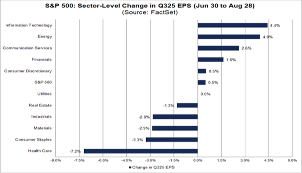 For example, during the months of July and August, analysts increased third-quarter EPS estimates. The bottom-up EPS estimate (an aggregation of median quarterly EPS estimates for all companies) increased this past earnings season by 0.5% from June 30-Aug. 28: