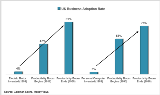 The exact timing of the productivity rocket is difficult to predict. But in both cases, it began about 15 years after the initial tech breakthrough, when about half of U.S. businesses adopted the technology.