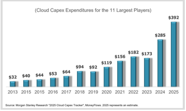 Consequently, we’ve seen investment only continue to increase. The current 11 largest companies already have confirmed their 2025 AI capital expenditures would rise to a record $392 billion: