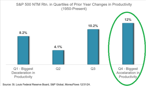 At the end of the day, we know stocks follow earnings. Looking at markets since 1950, you can see big gains in years following top-quartile productivity acceleration like we’re just beginning to experience: