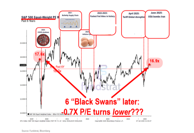 And when considering that six years and six “Black Swan” events later, the price-earnings ratio for the equal-weight S&P 500* is lower today than it was before COVID, it runs strongly contrary to the popular bear-ista narrative of late that the market is over-valued: