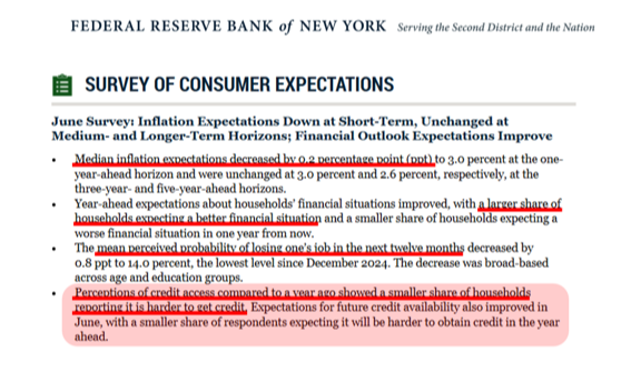 According to the Fed survey, one-year inflation expectations fell, more people think their finances will improve, fewer people are worried about jobs, and less people feared over tightening conditions: