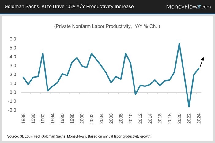 Doubters of AI-driven productivity gains need only look at how productivity grew 2.7% in 2024 alone. What’s more, Goldman Sachs estimates generative AI will raise annual U.S. labor productivity growth by about 1.5% per year over the next 10 years: