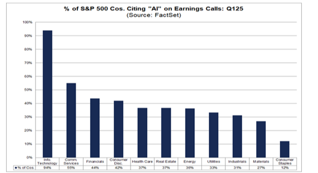 Yes, tech firms are the big adopters now. But it’s already becoming clear that productivity improvements will spread far and wide. For example, only last quarter AI was cited on earnings calls by over 40% of S&P 500 corporations:
