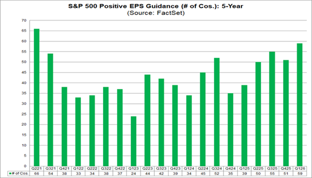 That’s above the five-year average of 44 and the 10-year average of 40. In fact, this marks the highest number of S&P 500 companies issuing positive EPS guidance for a quarter since Q2 2021.