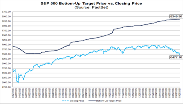 As of March 26 (the latest data), the 12-month bottom-up price target for the S&P 500 was $8,349.36, which was 28.9% above the closing price on that day of $6,477.16: