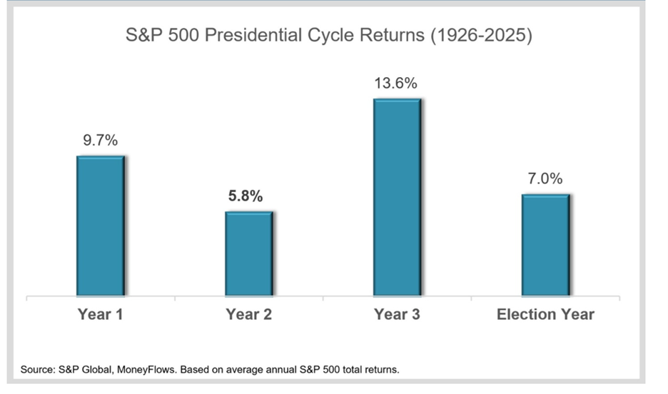 We have been beating the drum since last summer (and we’ll say it again) that midterm election years don't have a great track record. They're by far the weakest in the four-year presidential cycle, averaging just a 5.8% total return since 1926: