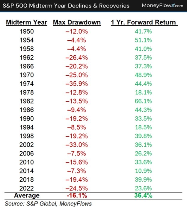 While that may feel somewhat warm and fuzzy, better yet, historically markets rebound off midterm lows quickly, but more importantly last well into the following year. Since 1950, the S&P 500 averages a 36% one-year forward return off midterm year lows.