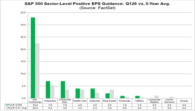 Going into Q1 earnings season, the information technology sector has the highest number of companies issuing positive EPS guidance of all 11 sectors, at a robust 33. This number is well above the five-year average of 22.5 and well above the 10-year average of 19.6 for the sector.