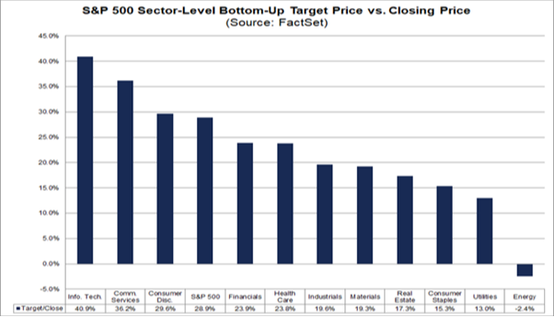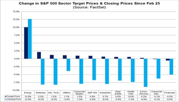 Digging a little further at the sector level, eight of the 11 sectors have recorded an increase in their bottom-up target price while at the same time seeing a decrease in their closing price since Feb. 25. Maybe not surprisingly, the only sector that has reported an increase in both bottom-up price and closure prices since Feb. 25 is the energy sector:
